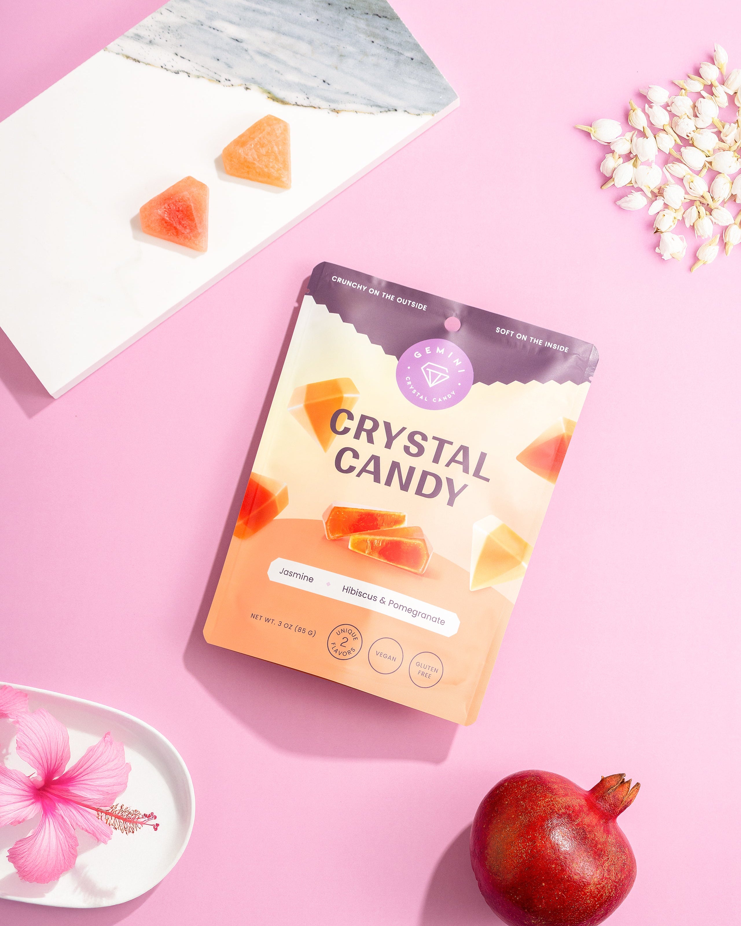 Escape into serenity with our Floral Duo — a soothing blend of handcrafted crystal candies inspired by delicate botanicals and bright, fruit-forward notes. Soft, fragrant, and refreshingly elegant, this bag is perfect for anyone craving a calming, floral-infused treat.